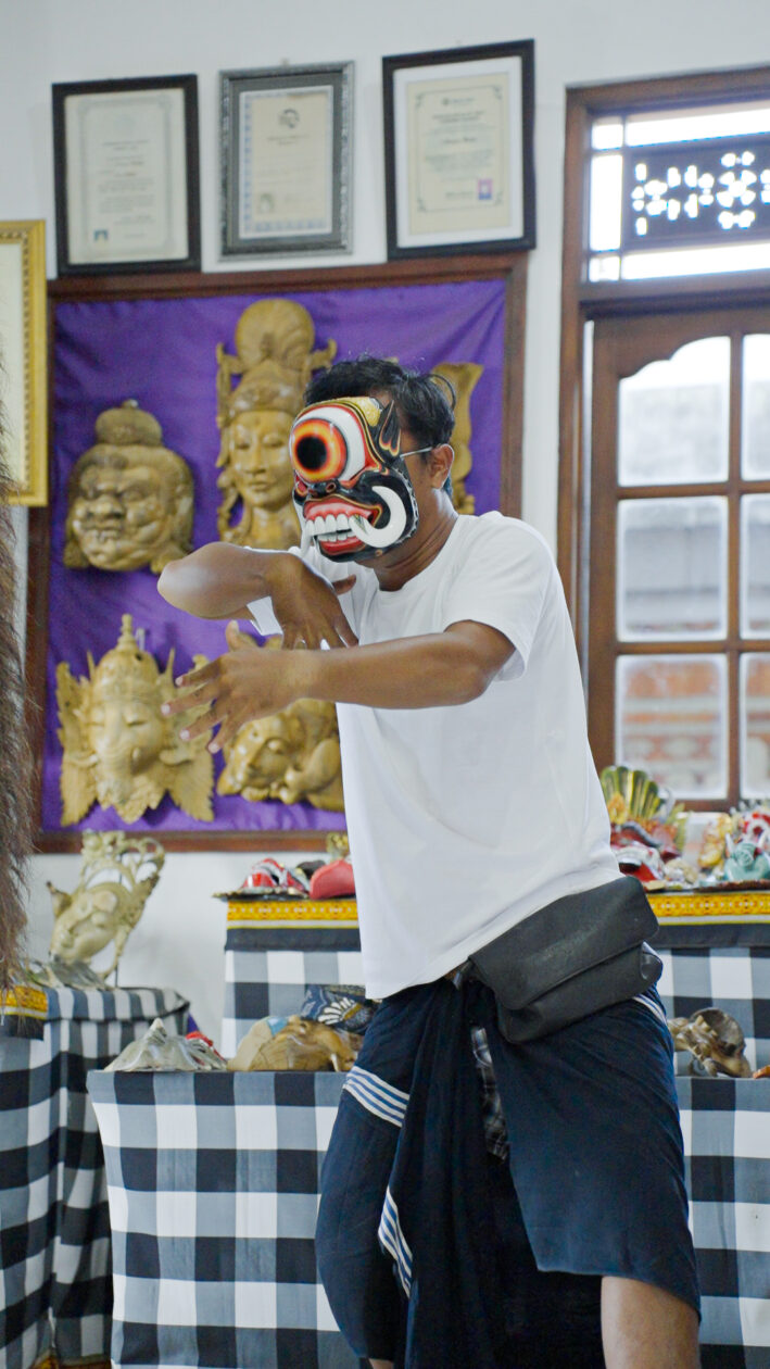 Every mask carries meaning, each one embodying sacred symbols intertwined with daily Balinese life. For instance, the Wali mask is essential in every religious procession. For entertainment, the Bebalihan mask reflects human expression—something Komang graciously demonstrated in a short yet captivating performance: a laughing mask for comedy, a slender one for shyness, and a one-eyed mask for a fierce, dramatic dance.