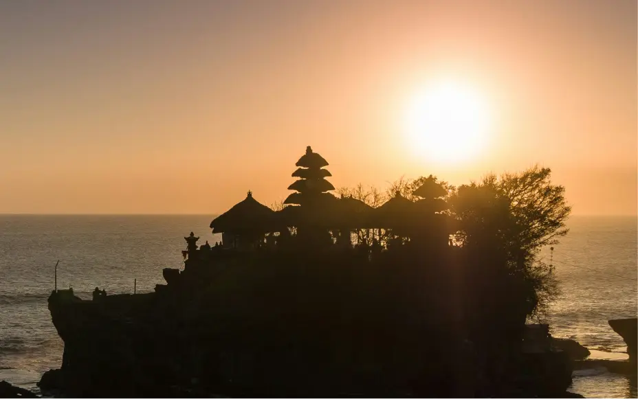 Tanah Lot Temple sits on a large rock formation surrounded by the ocean. During high tide, the temple appears to float in the middle of the sea, creating a picturesque view. This view becomes even more beautiful at sunset when the sky turns orange and red, creating a stunning silhouette of the temple.