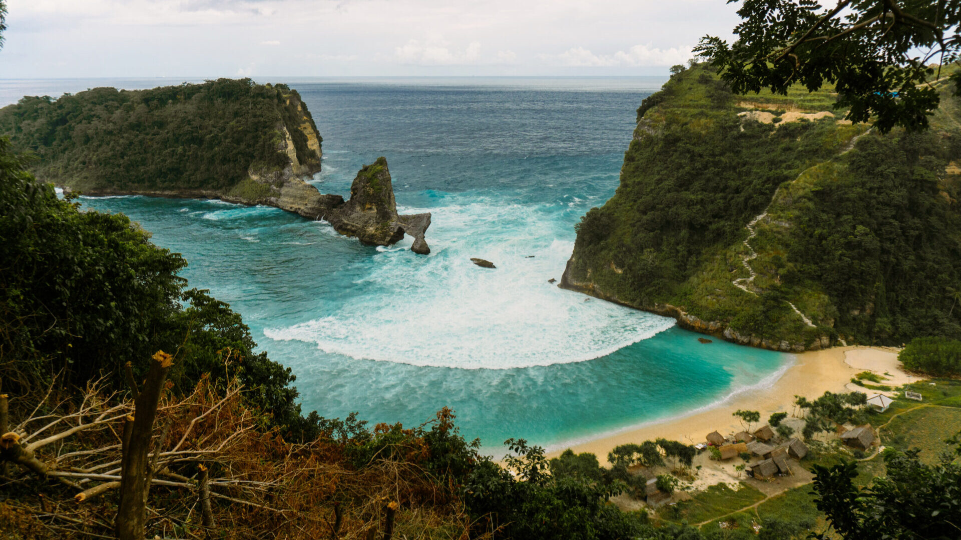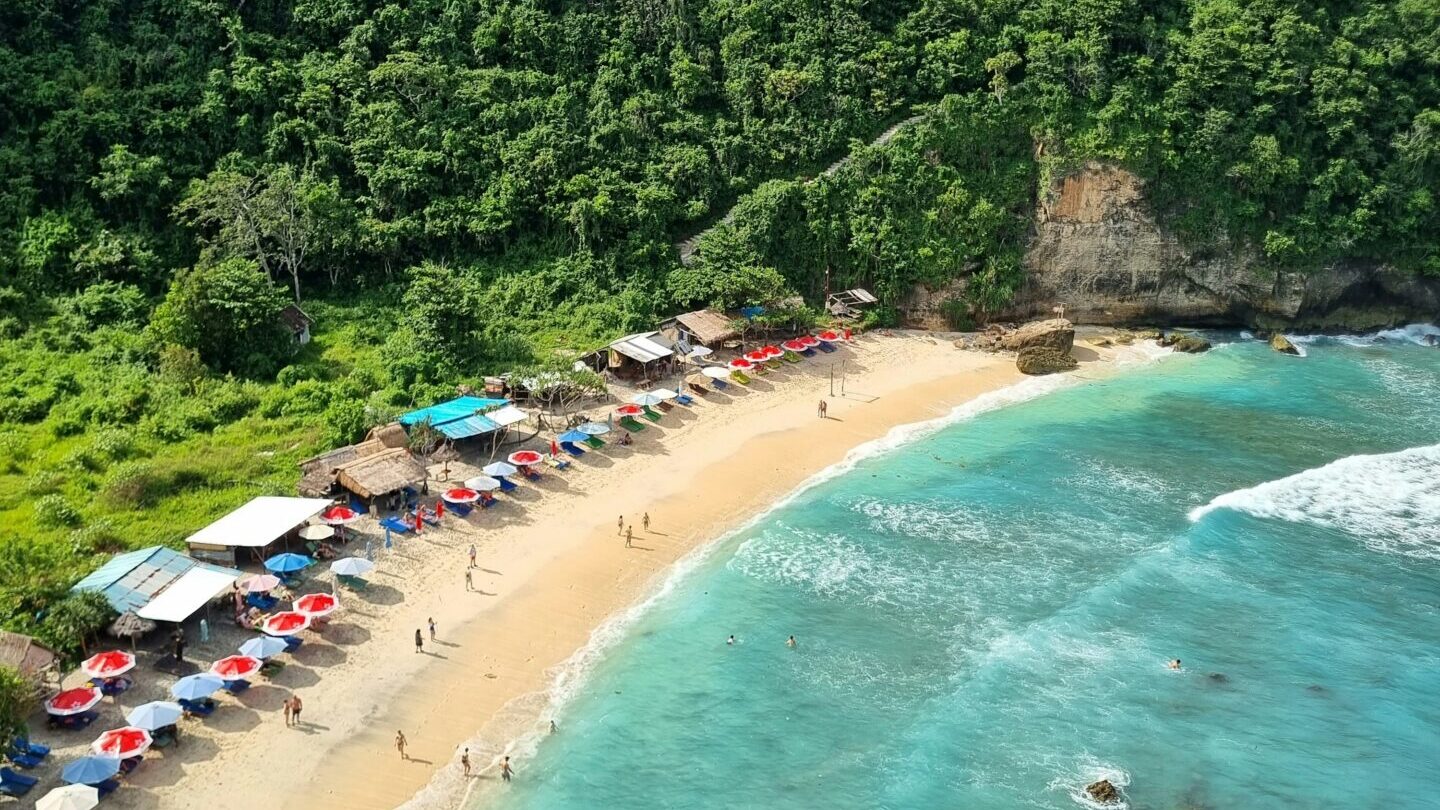 Start your exploration with the island’s biggest icon, Kelingking Beach. From above, the cliff resembles a T-rex curled around bright turquoise water, one of the most photographed landscapes in Indonesia. The hike down is intense and not for everyone, but even the viewpoint alone is worth the visit.